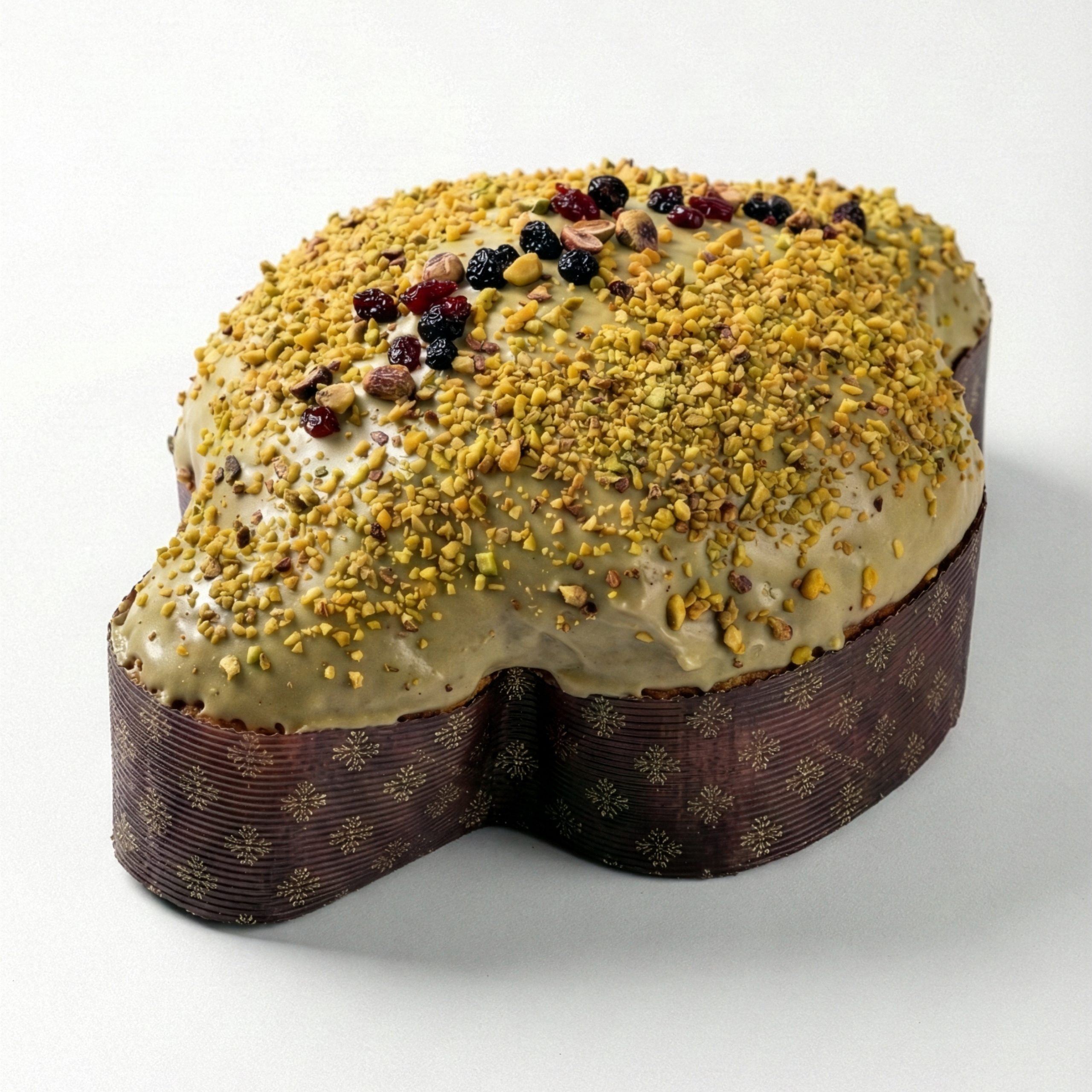 La nostra Colomba al Pistacchio e Frutti Rossi si presenta con un’estetica ricercata: una glassa di cremino al pistacchio, impreziosita da una pioggia di Granella di Pistacchio di Bronte leggermente tostata. Sotto la superficie croccante, l’impasto — lievitato naturalmente e realizzato con Burro di Normandia — risulta incredibilmente leggero, setoso e profumato.