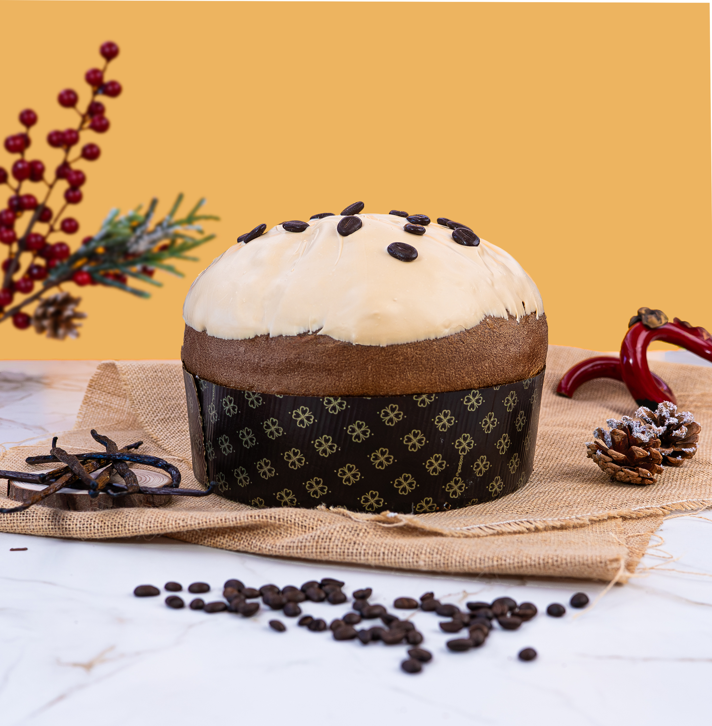 All’impasto classico del panettone viene addizionata un’infusione di caffè, che dona al lievitato il caratteristico color ambrato. La calotta è ricoperta da una delicata glassa al caramello e cioccolato, leggermente salato, e viene decorata da croccanti chicchi di caffè.