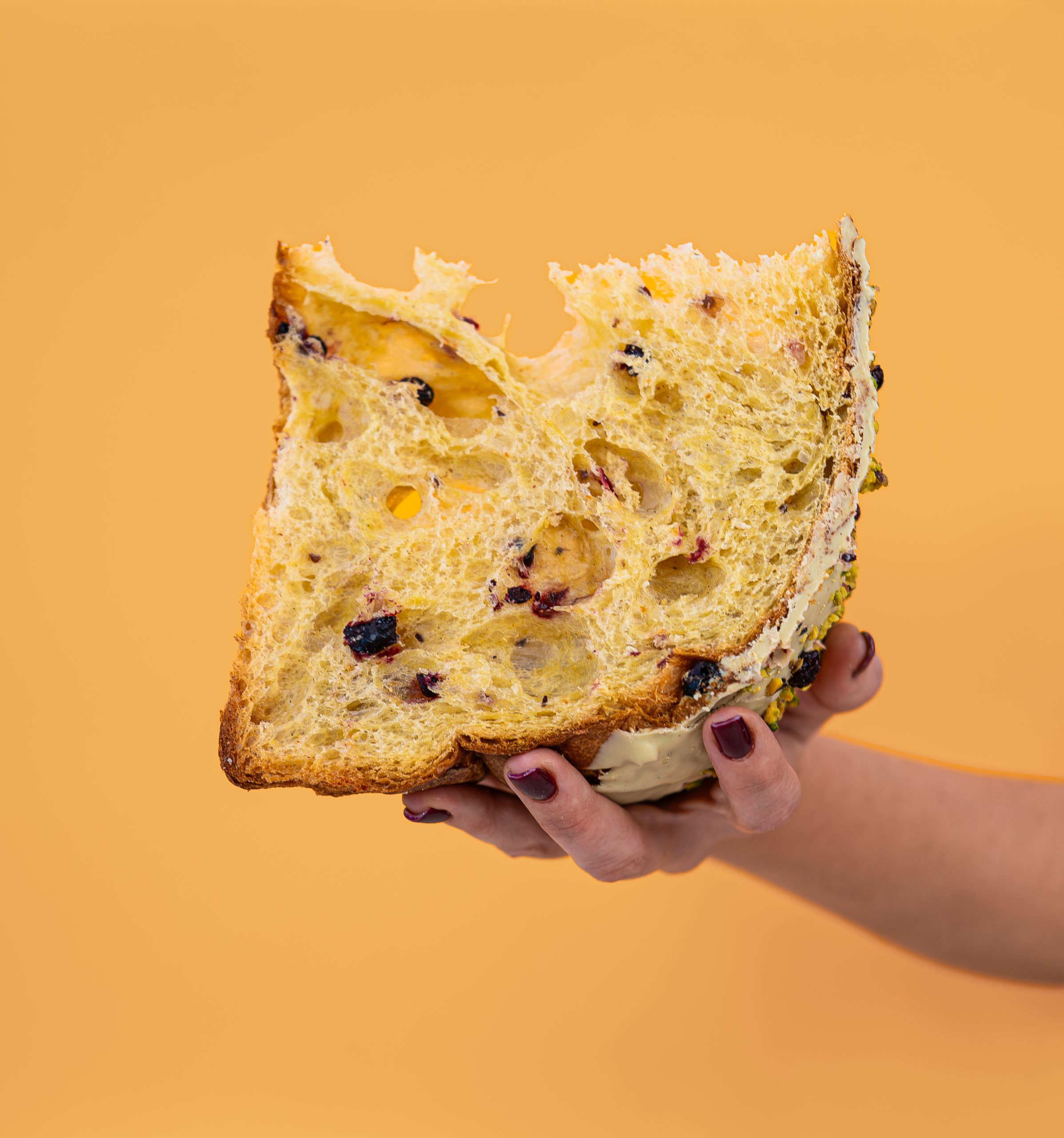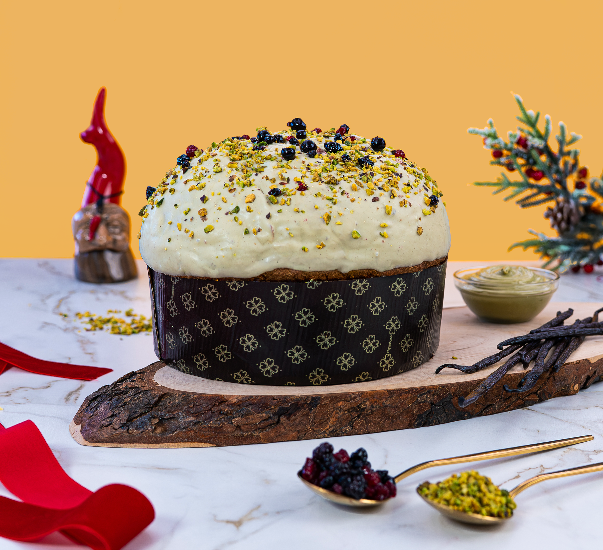 dei frutti rossi canditi che, insieme al cioccolato bianco, donano cremosità e dolcezza. A completare il lievitato, la presenza del cremino al pistacchio sulla cupola. Il tutto accompagnato da una sac à poche di crema al pistacchio.